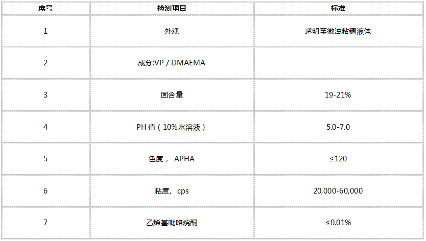 -- 該系列產品是無色透明液體,一種陽離子型共聚物。可形成透明、無粘性、柔韌的連續薄膜;對頭發有親和性,提供調理及堅挺的效果,積聚極少,令頭發更易梳理、有光澤、平整、易做發型;可與陰離子、非離子及兩性表面活性劑配伍;對眼和肌膚無刺激性。
