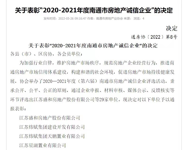近日,南通市房地產(chǎn)業(yè)協(xié)會(huì)公布了關(guān)于表彰“2020-2021年度南通市房地產(chǎn)誠(chéng)信企業(yè)”的決定。決定指出,協(xié)會(huì)秉承公開、公平、公正的原則,通過企業(yè)申報(bào)、材料審核、媒體公示、反饋核實(shí)等環(huán)節(jié)評(píng)選出江蘇盛和房地產(chǎn)股份有限公司等29家單位,予以通報(bào)表彰。